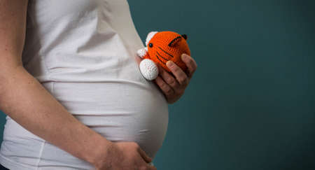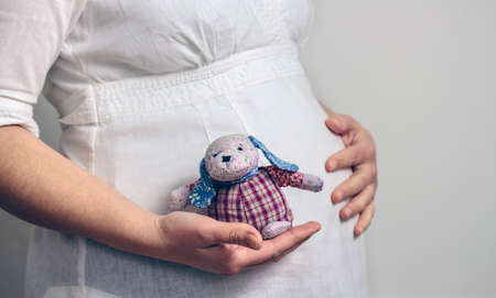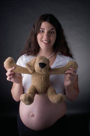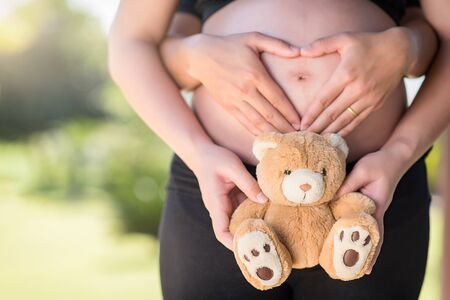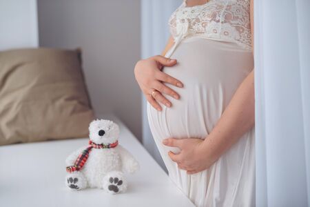Cropped image of lovely mother holding cute bear doll. Conceptual shot of healthy pregnant woman feeling and expectation for her baby.