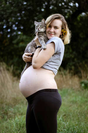 pregnant girl with a cat in her arms. carefree life. happy pregnancy.