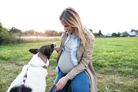 A pregnant woman in a bathing suit plays with a dog leaving the house for a walk. Feeling happy with nature background. Enjoying a summer day in the nature, healthy pregnancy, freedom concept.