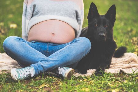 Unrecognizable young pregnant woman on a walk with a dog, feeding him. Green sunny nature