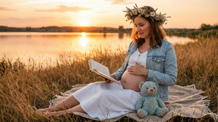 A serene expectant mother sits on a blanket in a golden field, reading a book with her teddy bear. The sun sets over the water behind her, creating a warm, tranquil atmosphere.