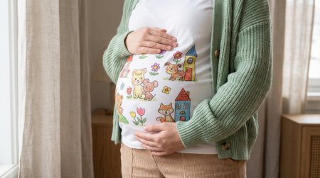 Close up of a pregnant woman in a green cardigan holding her baby bump. Her shirt has colorful illustrations of animals, symbolizing the coming baby.