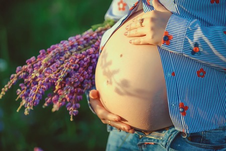 Closeup picture of belly of pregnant woman near blue river, summer time, pregnancy girl