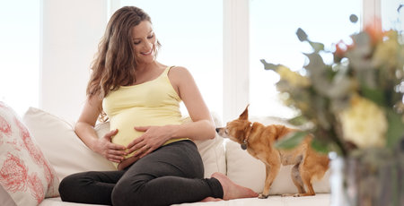 Would you like to feel the baby kick. a young pregnant woman sitting on her sofa with her dog next to her.