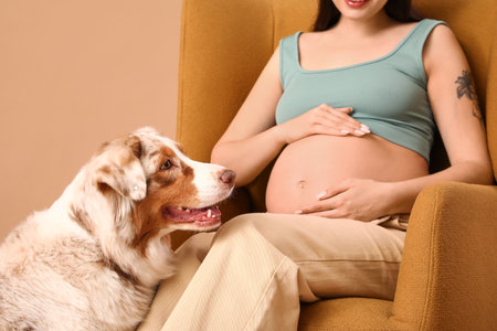 Young pregnant woman with cute Australian Shepherd dog sitting on armchair against beige background, closeup