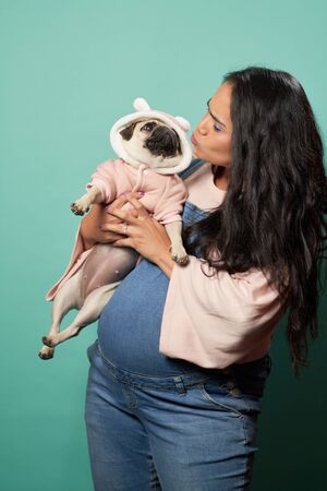 Pregnant woman with big belly in anticipation getting ready for the maternity at home. Cute pet pug dog showing affection and intimacy for the baby. preparing for the birth of a child