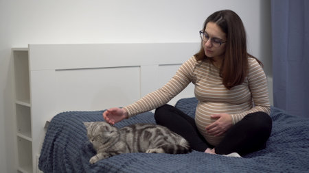 A young pregnant woman with glasses is stroking a cat. A girl in a bedroom on a bed with a British cat.