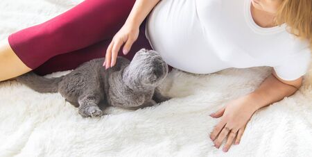 A pregnant woman with a cat lies in bed. Selective focus. animal.