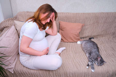 A pregnant woman holds on to a sore head, problems and diseases during pregnancy