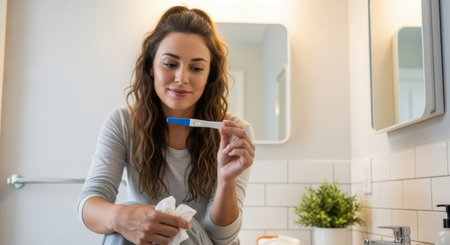 A young woman in a bright bathroom anxiously awaits her pregnancy test results, holding the test in one hand and tissues in the other, with a hopeful expression.