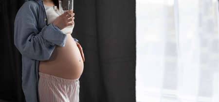 unrecognizable pregnant woman with a glass of clean water at the window, healthy pregnancy lifestyle, pregnancy, motherhood and expectation concept