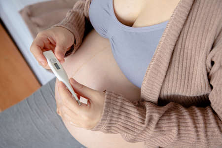 young pregnant woman hold digital thermometer, concept of healthy care pregnancy.