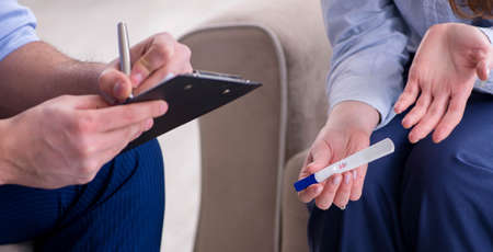 Artificial insemination. doctor's hand in glove holding positive pregnancy test with two stripes. Blue background