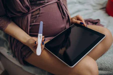 A woman holds a pregnancy test in one hand and a tablet in the other hand