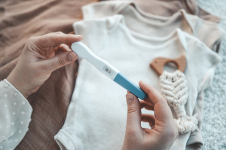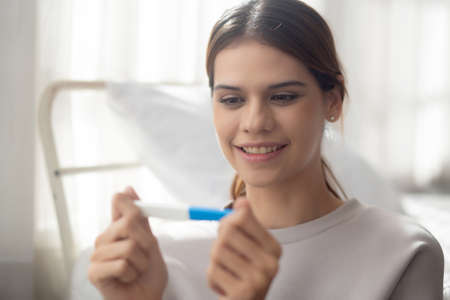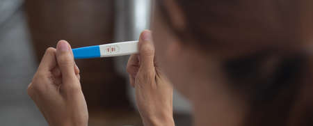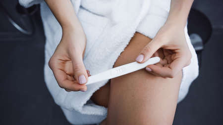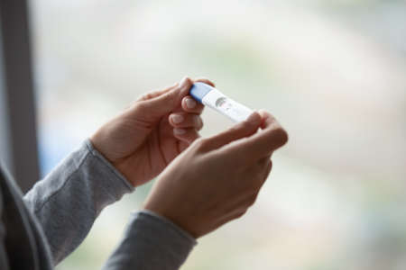 Two bars. Close up of woman hands holding positive home pregnancy test, confused female meeting unexpected gestation thinking making difficult choice, happy lady receiving news of awaited maternity