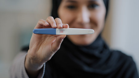 Portrait smiling blurred arabian young woman pregnant muslim girl in hijab future mother showing positive pregnancy test result on camera sharing good news in anticipation of childbirth maternity love