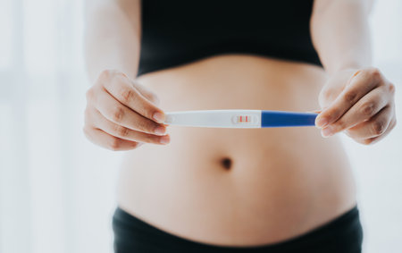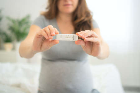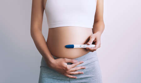 Close up shot of two month pregnant woman showing pregnancy test with positive result over her belly