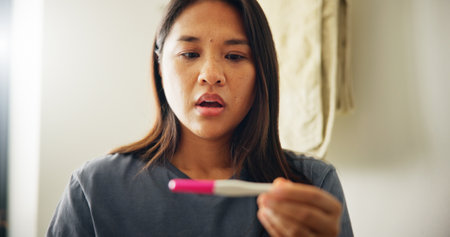 Pregnancy test, result and surprise with woman in bathroom of home for reaction to fertility. Pregnant, reading or wow expression and Asian person in apartment with anxiety, concern or stress