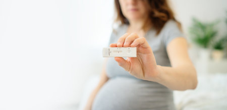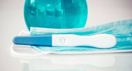 Pregnant woman making test. Close up of fingers holding express antigen covid corona test, negative result sarscov2.