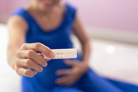 Pregnant asia woman in blue dress hole and show a pregnancy test strip with happy and excited, close up of pregnancy test strip