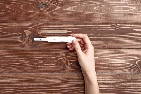 Pregnancy test with positive pregnan in woman's hand. Copy space