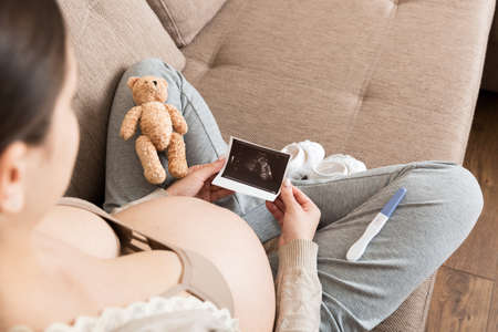Top view cropped of pregnant woman with ultrasound photo of fetus standing at home, young future mom waiting child first baby, pregnancy and motherhood concept