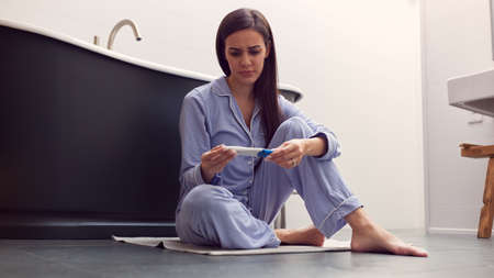 Disappointed Woman Sitting On Floor In Bathroom At Home With Negative Home Pregnancy Test