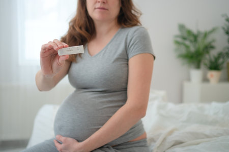 Anxious expecting mother examining PCR test outcome at home. Modern diagnostic method for detecting infections during pregnancy.