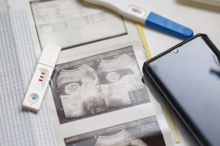ultrasound picture with baby and pregnancy test on beige background with copy space