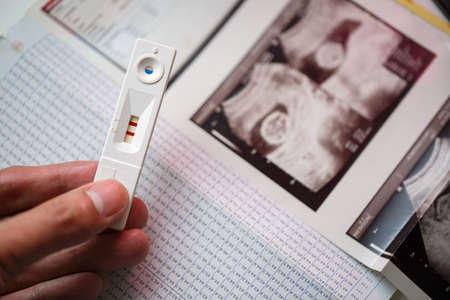 High Angle View Of Pregnancy Test With Sonography On Wooden Desk