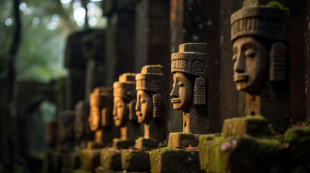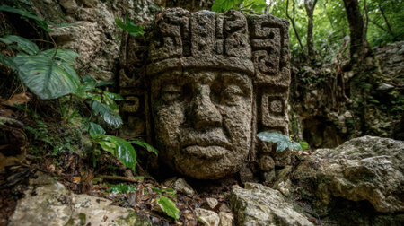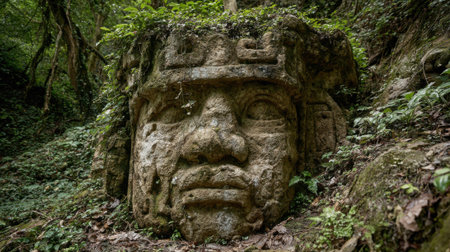 A detailed stone face emerges from moss-covered rocks surrounded by lush greenery in a dense forest. This ancient artifact highlights the culture of a forgotten civilization.