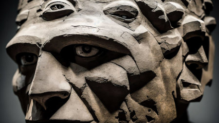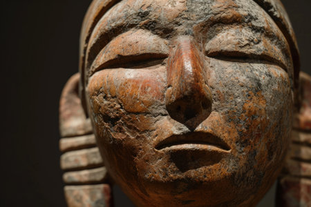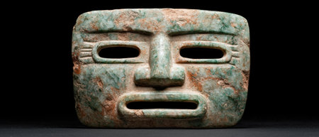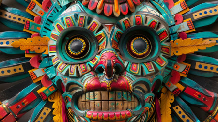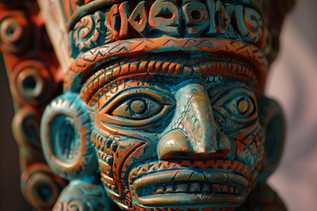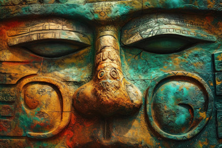 This image showcases a detailed stone carving of a stylized face with a complex design. The artwork features a combination of teal, brown, and gold hues. The composition is frontal and symmetrical, with strong textures. Suitable for illustrating history, art, and cultural heritage, it could be used for various editorial and commercial purposes.