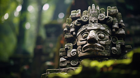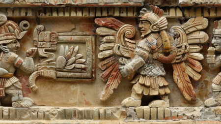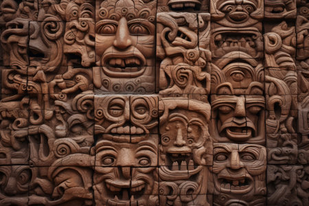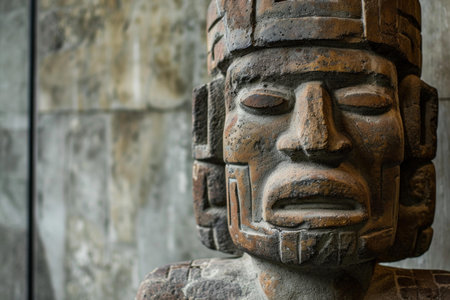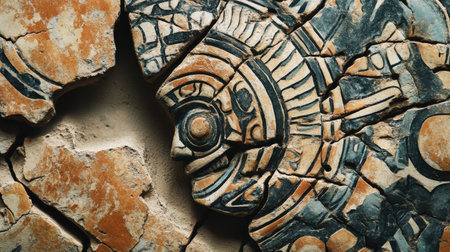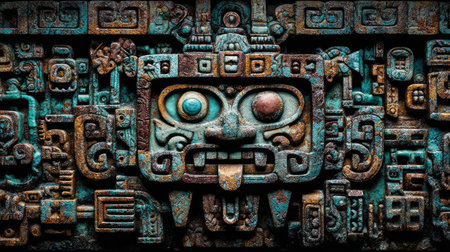 Stone carving featuring intricate Aztec design with prominent facial expression. Detailed artwork on textured surface highlights ancient craftsmanship. Concept of cultural heritage, history, art.
