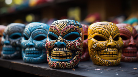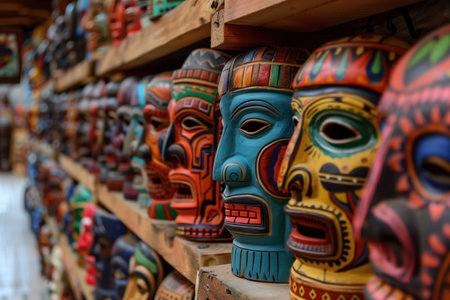 A row of colorful masks on a shelf. The masks are of different shapes and sizes, and they are arranged in a way that makes them look like they are on display. Scene is one of curiosity and intrigue