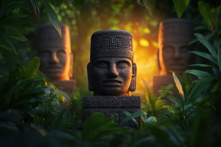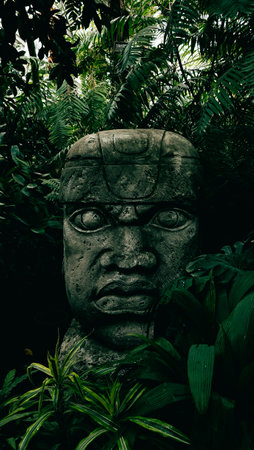 Olmec colossal head radiating ancient wisdom and mystique in a lush tropical setting