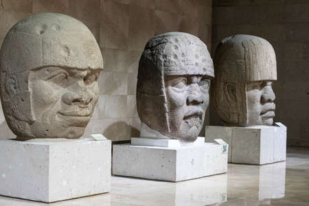 XALAPA, VERACRUZ, MEXICO- FEBRUARY 20, 2020: Traditional Olmeca heads from Tabasco, Veracruz, Mexico at Museo de Antropologia de Xalapa at Xalapa, Veracruz, Mexico