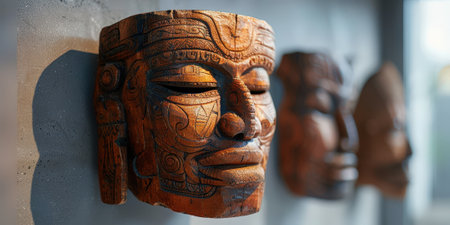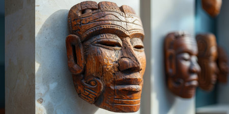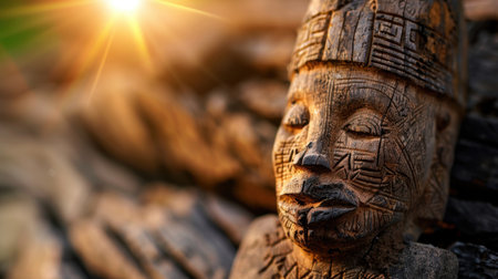 A beautifully crafted wooden sculpture that showcases intricate details of an ancient culture, illuminated by sunlight, creating a stunning visual experience.
