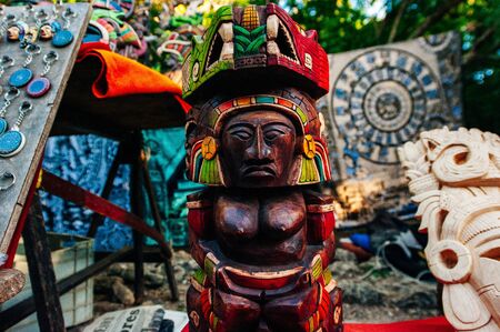 Different wooden souvenirs at the local Mexican market in the Chichen Itza