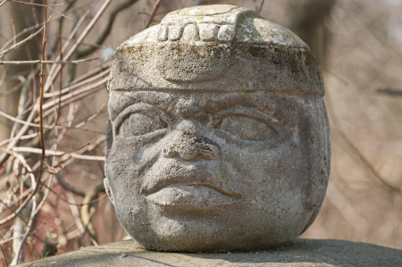 07/09/2022. Russia, Moscow, Lomonosov Botanical Garden. Mexican Olmec or Mayan head statue decorates the garden of the tropics