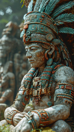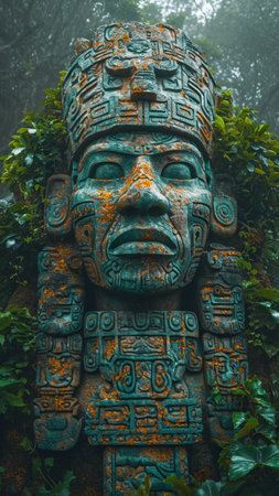 Ancient Mayan statue with glowing eyes and ornate headdress, conveying power and mystery against a dark background