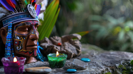 A captivating image featuring a colorful tribal mask alongside glowing candles and smooth stones, set in a tranquil natural environment with lush greenery.