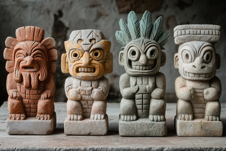 Colorful stone carvings of ancient figures arranged in a row. Intricate designs showcase artistic craftsmanship. Displayed on textured stone surface in cultural setting.