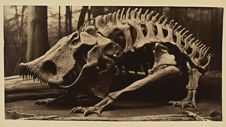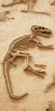 Captivating image showcasing the remarkably well preserved fossilized skeleton of a prehistoric dinosaur discovered buried within the rugged textured geological landscape
