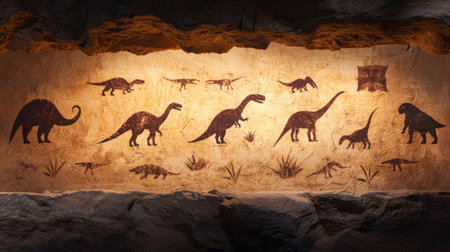 This captivating image features ancient cave art showcasing dinosaurs in dynamic poses, illuminated softly to highlight textures and colors. Perfect for educational use.