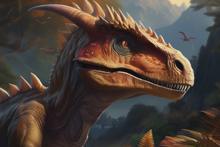 Close-up image of mean looking dinosaur in amusement dino park at Arboretum volcji potok near Radomlje in Slovenia.