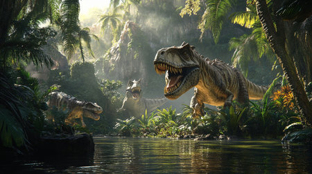 Tyrannosaurus dinosaurs monster reptile hunting in the forest