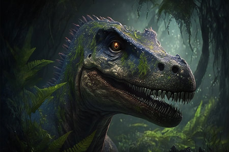 Tyrannosaurus or T-Rex staring out from the jungle burst with cinemeatic light