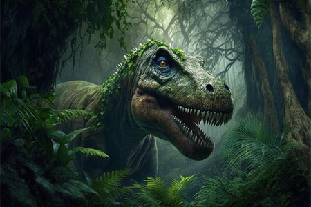 A fierce t. rex looms among vibrant green foliage, its piercing eyes and open jaws exuding primordial power in a dense jungle backdrop.