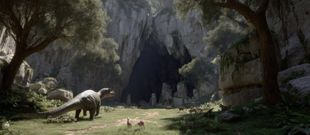 A dinosaur stands in a sunlit forest clearing, with a shadowed cave opening in the background. The scene features lush vegetation, trees, and rocky textures. The overall style suggests a natural environment, potentially suitable for educational content or illustrations related to prehistoric life and evolution.