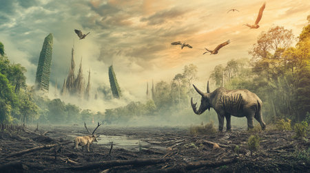Amidst deforestation, rare animals appear against a backdrop of destruction, symbolizing species loss and the urgency for conservation.
